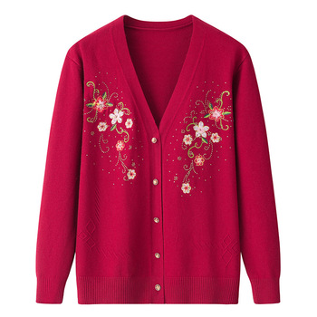 Nueva llegada de mujeres de mediana edad y ancianos suéter con cuello en V Jacquard prendas de punto con manga larga cárdigan abrigo suéter para mujer